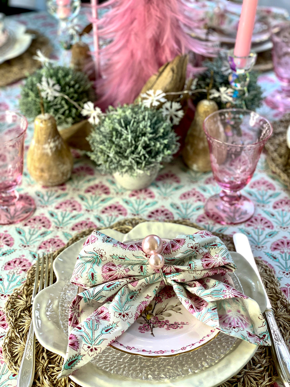 The Cotton Candy Napkin is perfect for a summer in the Hampton's or Nantucket. Hand cut & block printed for the lovely hostess. Our table décor is made by artisans in Jaipur, India.