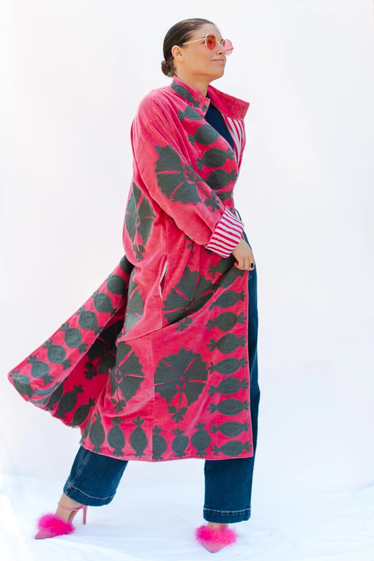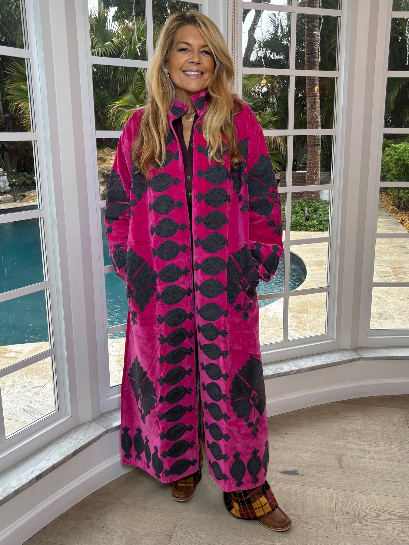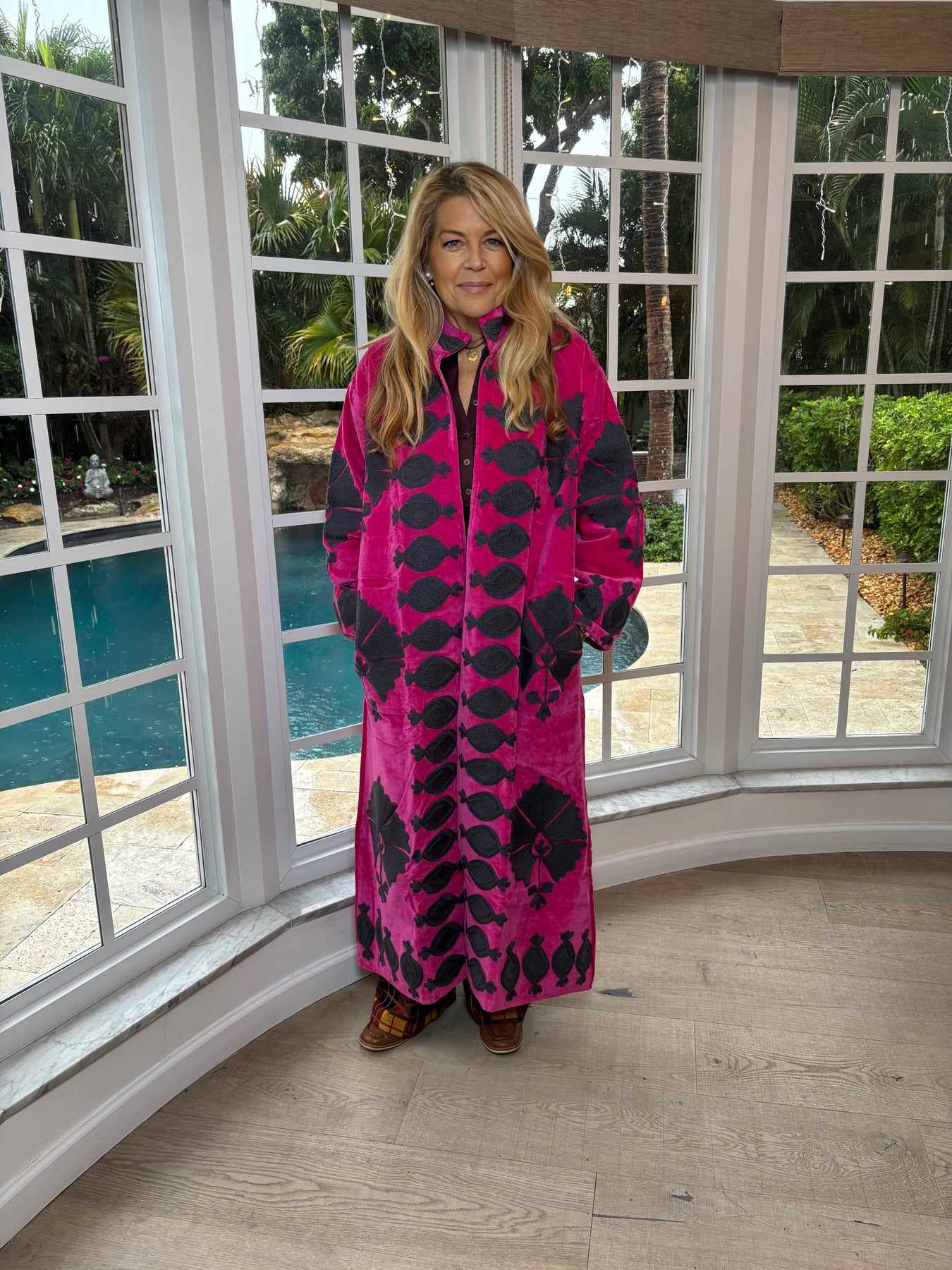 Command attention in this statement-making velvet duster, finished with bold Suzanni embroidery that feels equal parts rock-and-roll and heirloom artistry. With its tailored silhouette and dramatic sweep, it’s the kind of piece that instantly transforms a simple outfit into a full look. Throw it over denim for an effortless day vibe or layer it with silks and boots when you’re ready to steal the spotlight.