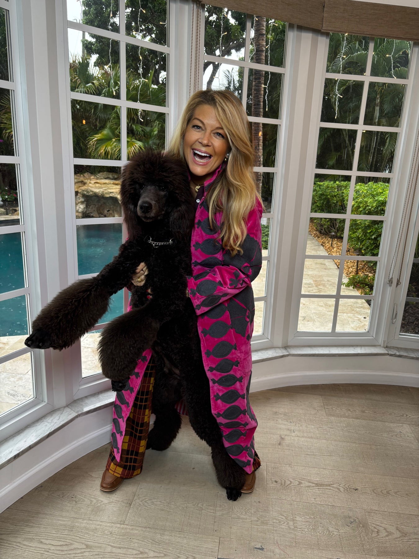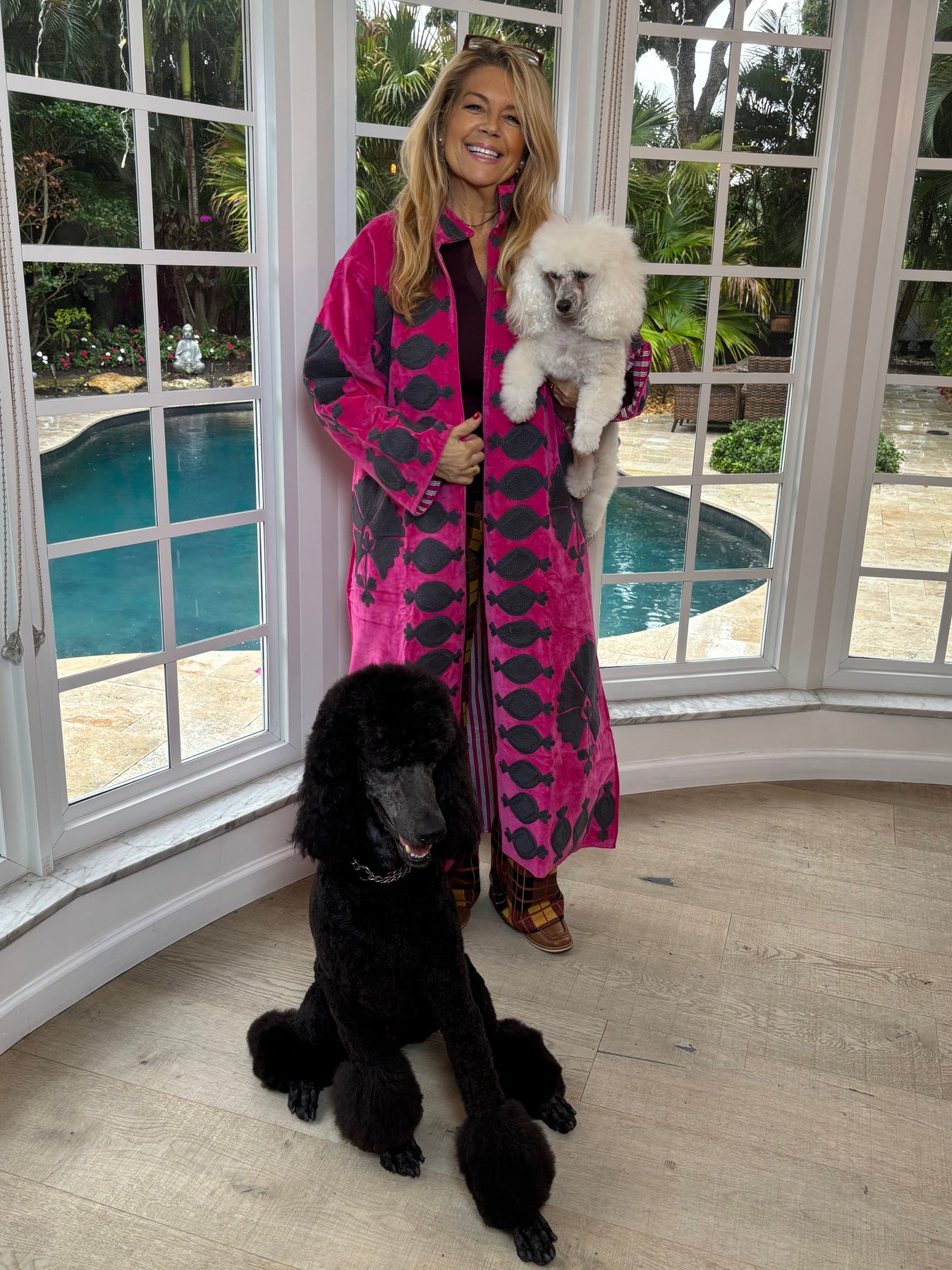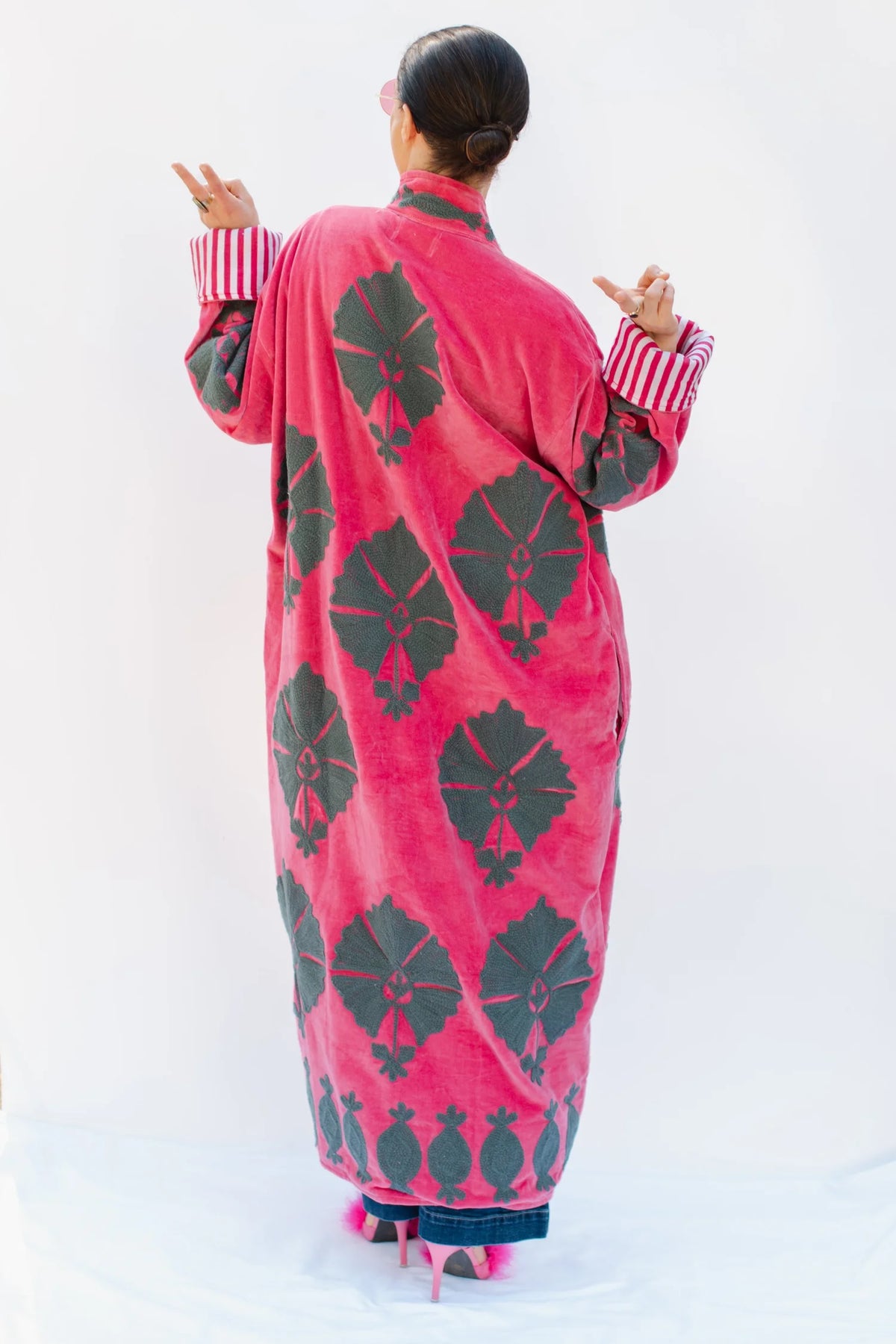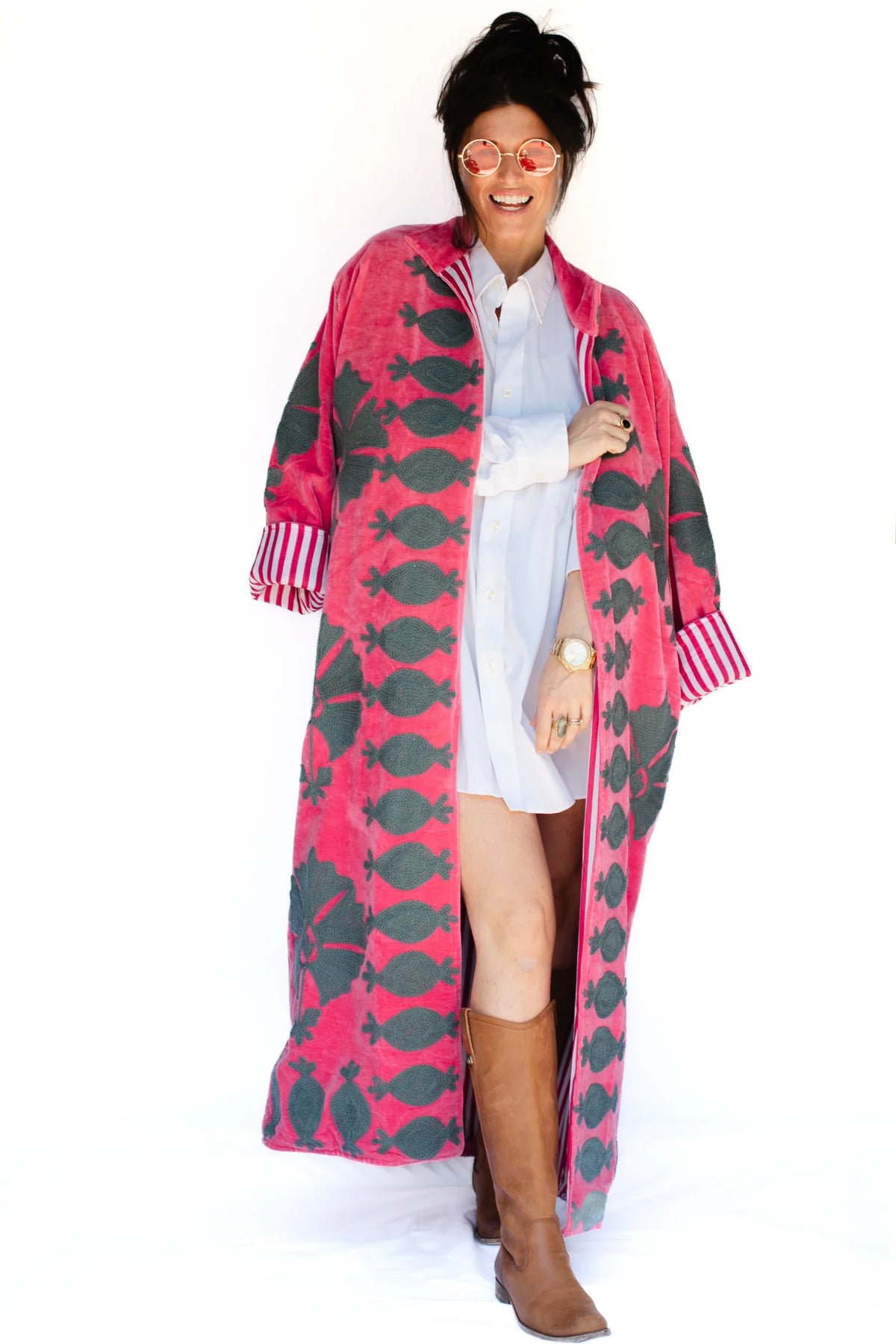Command attention in this statement-making velvet duster, finished with bold Suzanni embroidery that feels equal parts rock-and-roll and heirloom artistry. With its tailored silhouette and dramatic sweep, it’s the kind of piece that instantly transforms a simple outfit into a full look. Throw it over denim for an effortless day vibe or layer it with silks and boots when you’re ready to steal the spotlight.