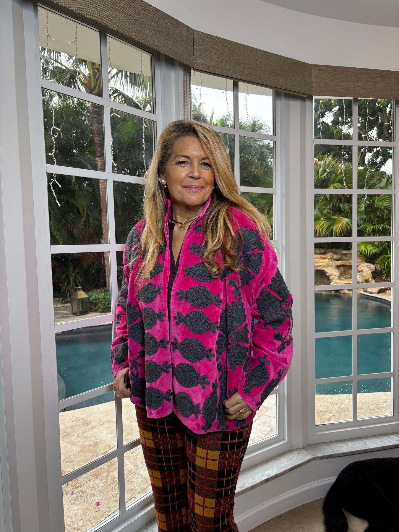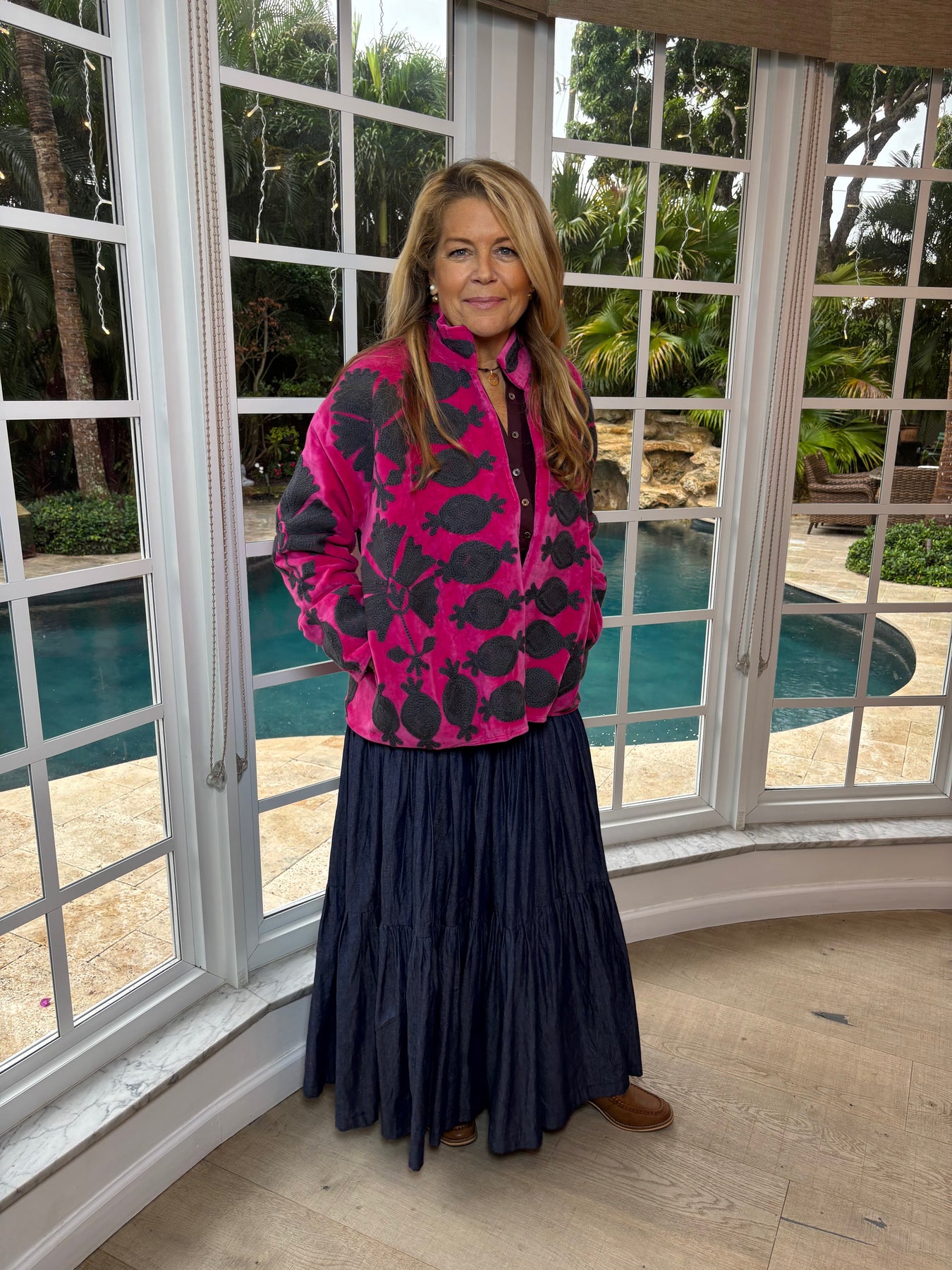 Meet the Crew. Tailored to a flattering hip length, it’s crafted from lustrous velvet and illuminated with hand-finished Suzanni embroidery—an artful interplay of texture, color, and heritage craft. The silhouette balances structure with ease, designed to slip seamlessly from evening affairs to off-duty elegance. A collector’s piece in its own right, this jacket transforms every ensemble into a composition of sophistication and style.